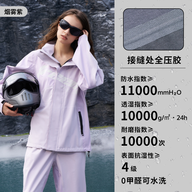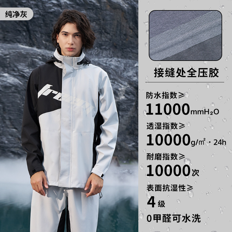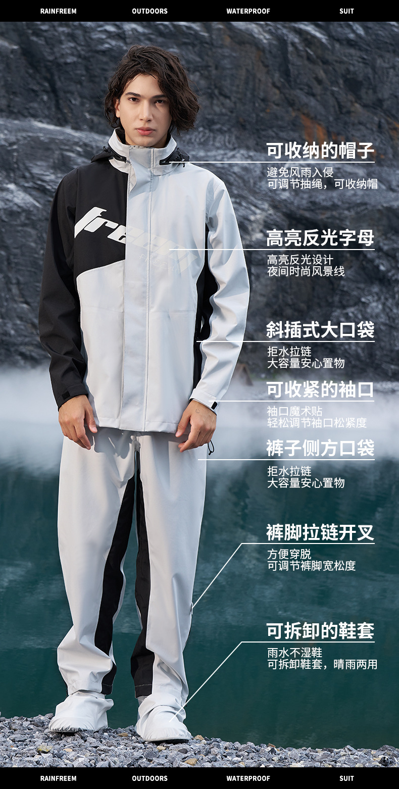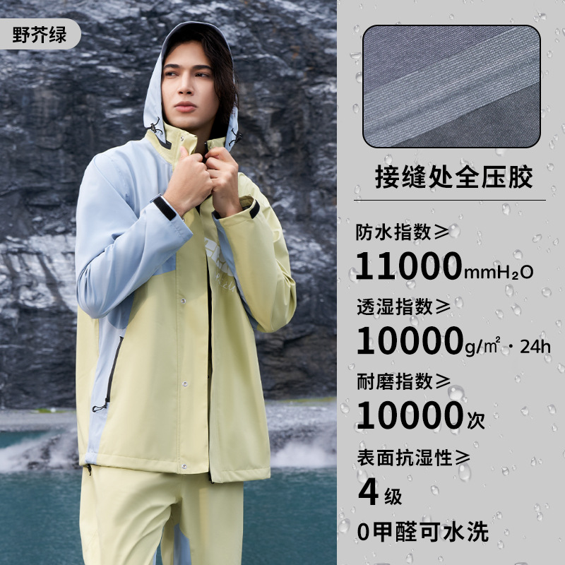 主要特点:可水洗骑行雨衣套装,采用三层布复合面料,防水、透湿性能达到冲锋衣国家标准要求,配有可拆卸鞋套,适合下雨天户外运动、摩托车骑行等。