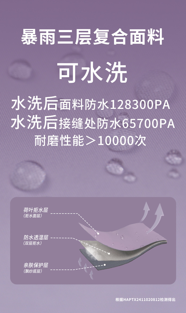 性能指标:水洗后面料防水静水压 128.3 kPa (即 12830 mm H2O),水洗后接缝处防水静水压 65.7 kPa (即 6570 mm H2O),透湿率洗前洗后均在 10000 g/(m2*24h) 以上,耐磨性能大于1万次,完全符合最新国家标准GB/T 32614-2023《户外运动服装 冲锋衣》要求。