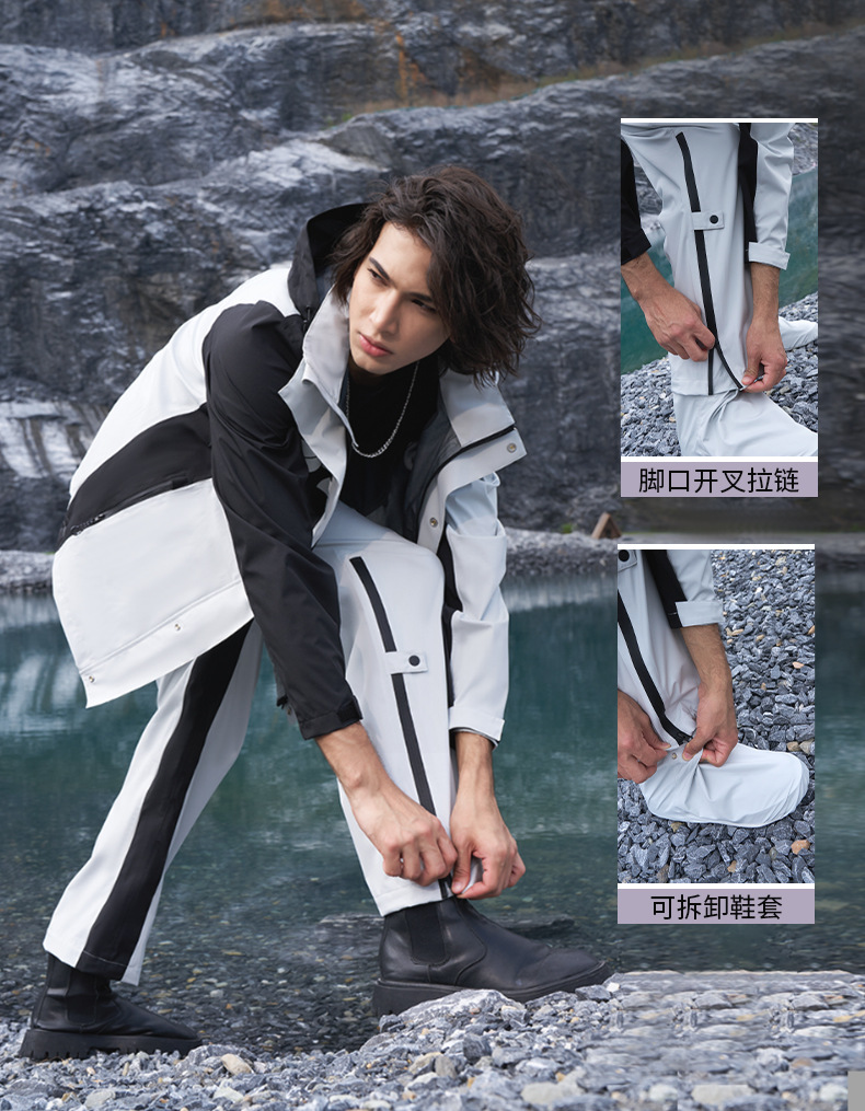 图3:琴飞曼晴雨两用多功能骑行服,脚口开叉拉链、可拆卸鞋套