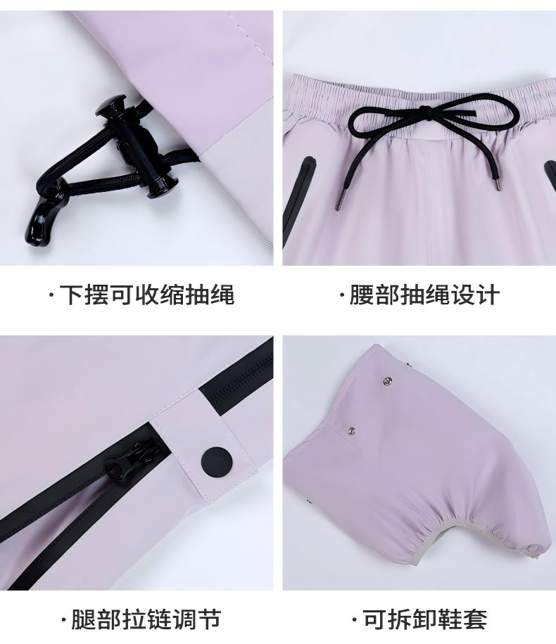 图6:细节展示可拆卸鞋套、腿部拉链、腰部抽绳、可收纳帽子等设计