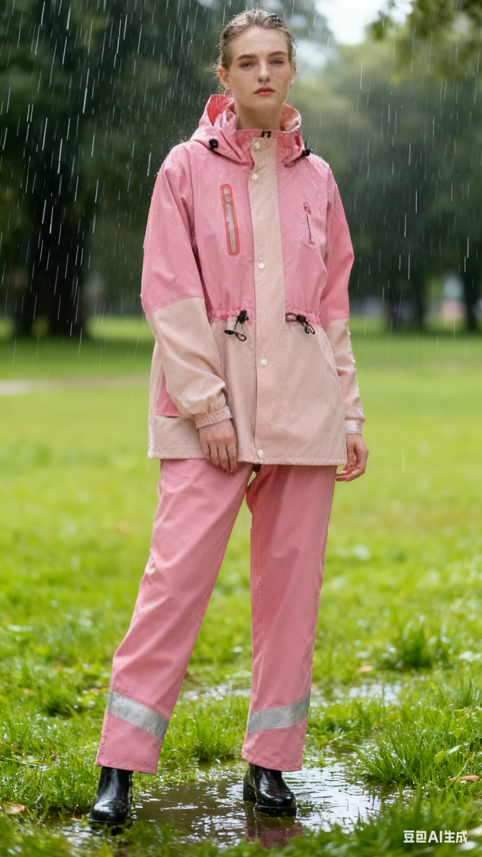 图1:琴飞曼拼色雨衣套装,雨天户外场景,豆包AI生成