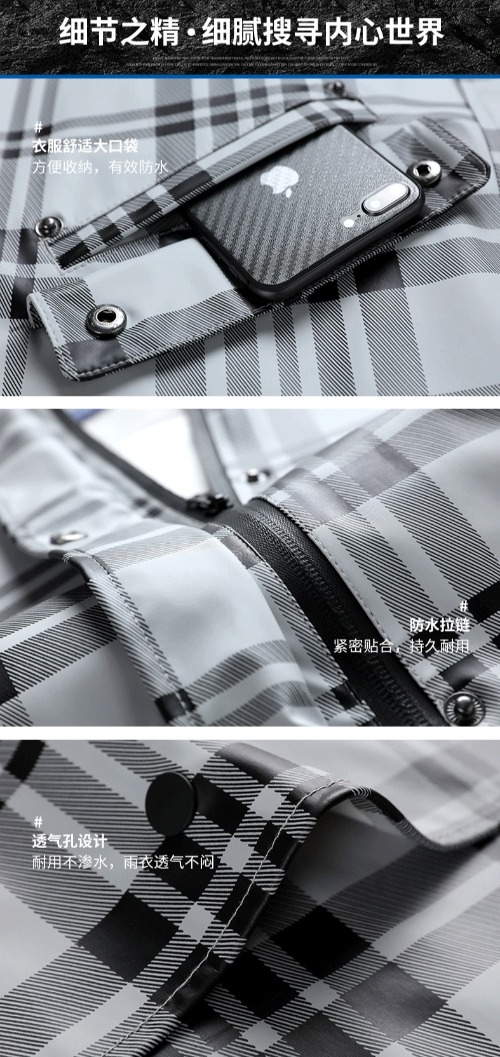 图3:琴飞曼时尚格纹风雨衣,细节展示大口袋、防水拉链、透气孔设计