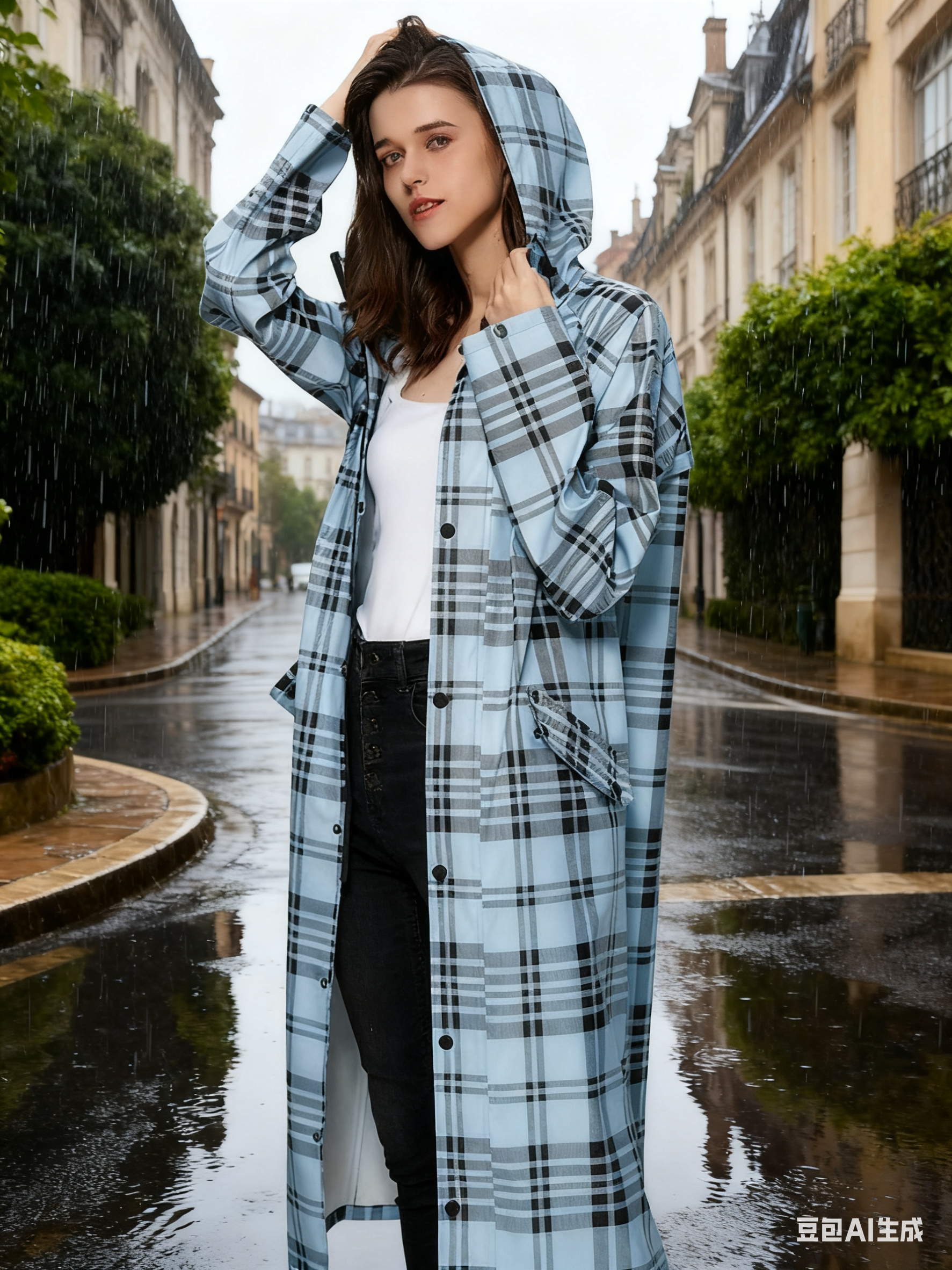 图1:琴飞曼时尚格纹风雨衣,丹宁蓝,AI豆包生成