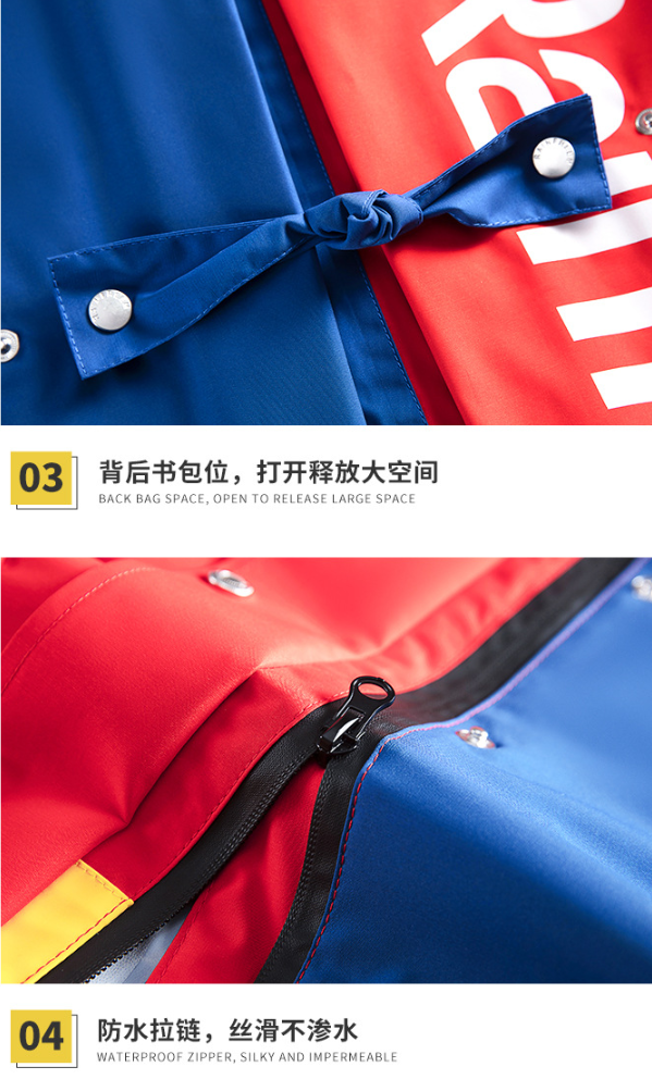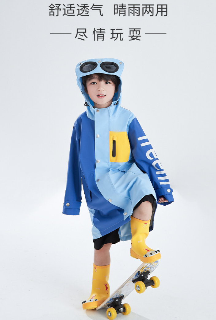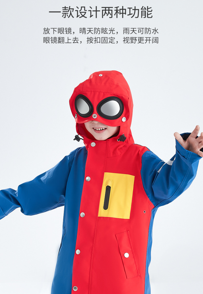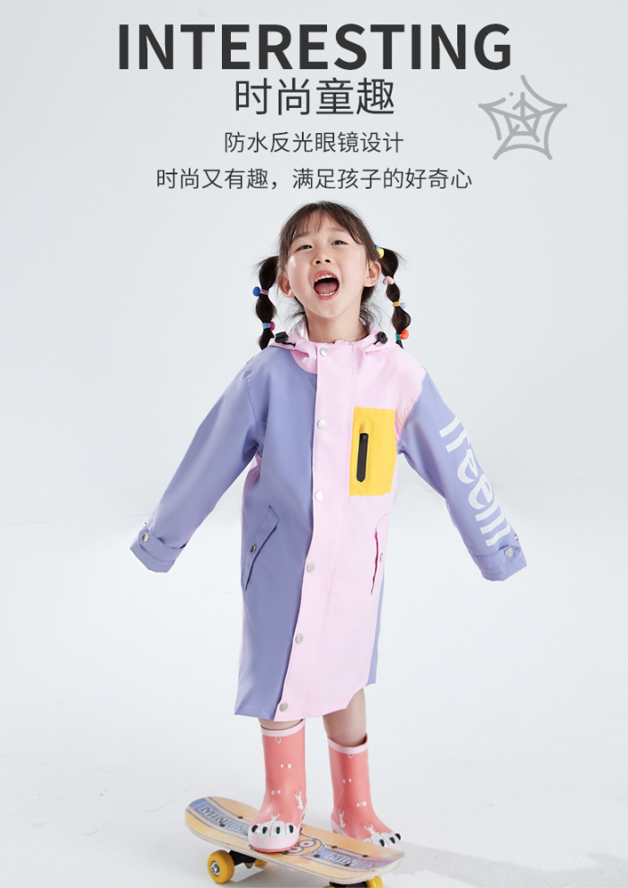 儿童长款风雨衣,太阳镜连帽设计,精致拼色设计,背后有隐形书包位,美观实用。