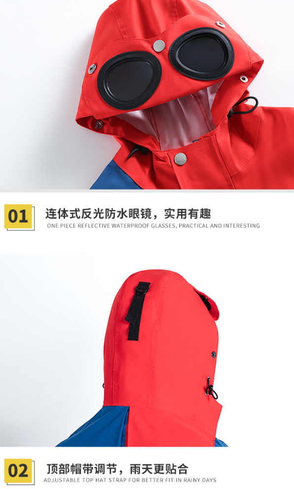 主要特点:炫目拼色风衣式雨衣,时尚防水反光眼镜连帽设计,造型别致。