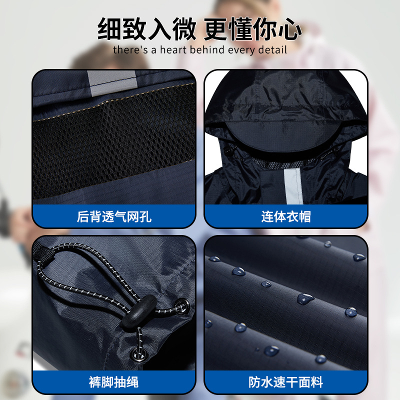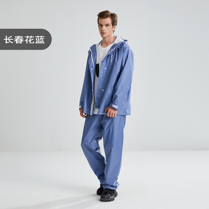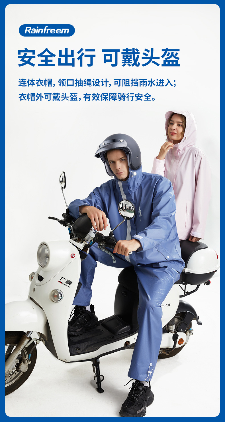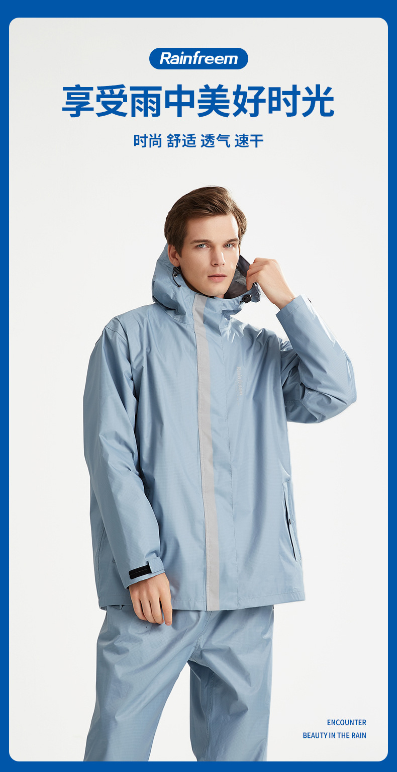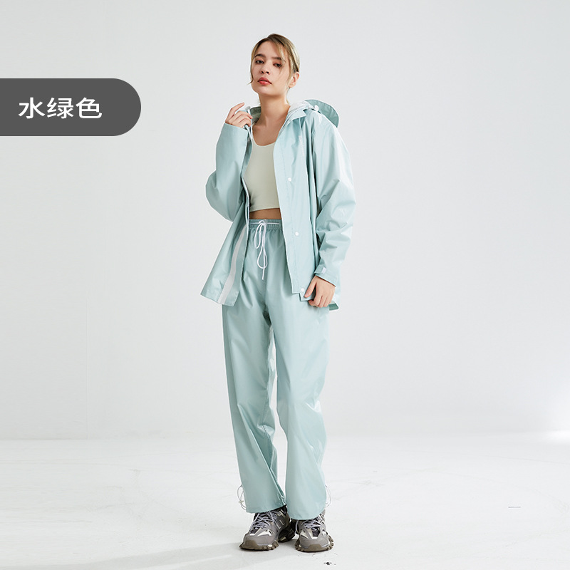 简约设计,雨衣雨裤套装,时尚、舒适、透气、速干,适合摩托车、电动车骑行与户外运动休闲活动。
