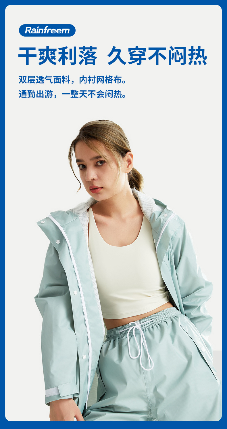 图1:琴飞曼新色系双层防雨雨衣套装,时尚、舒适、透气、速干