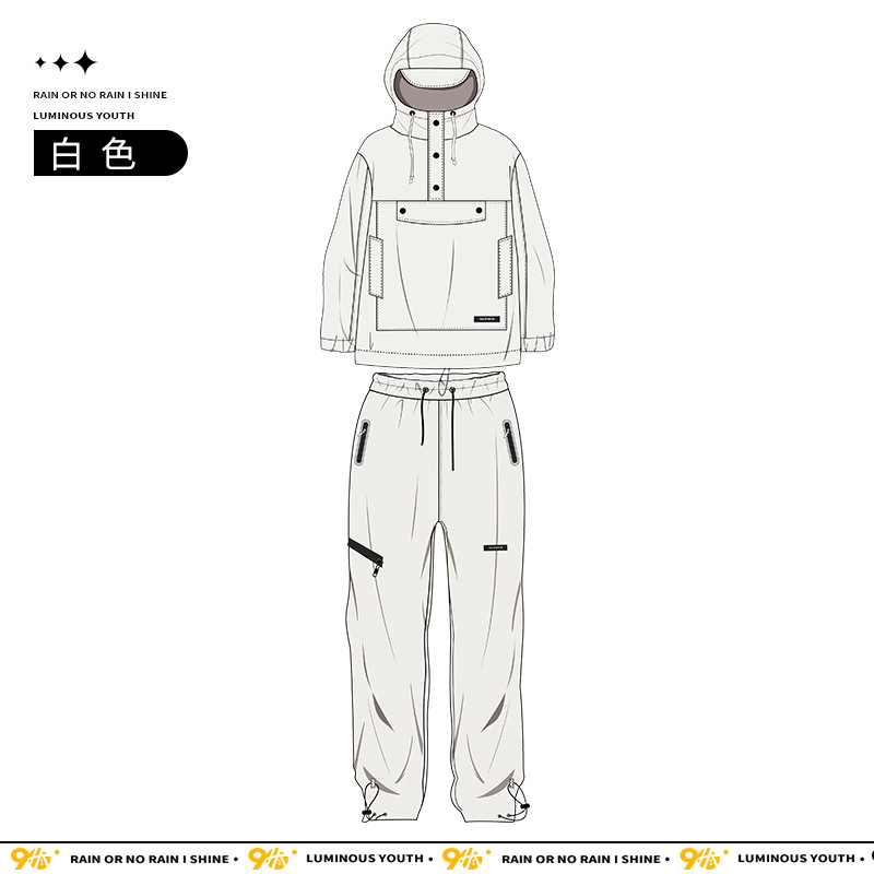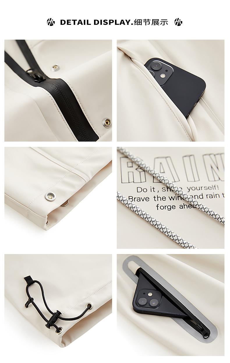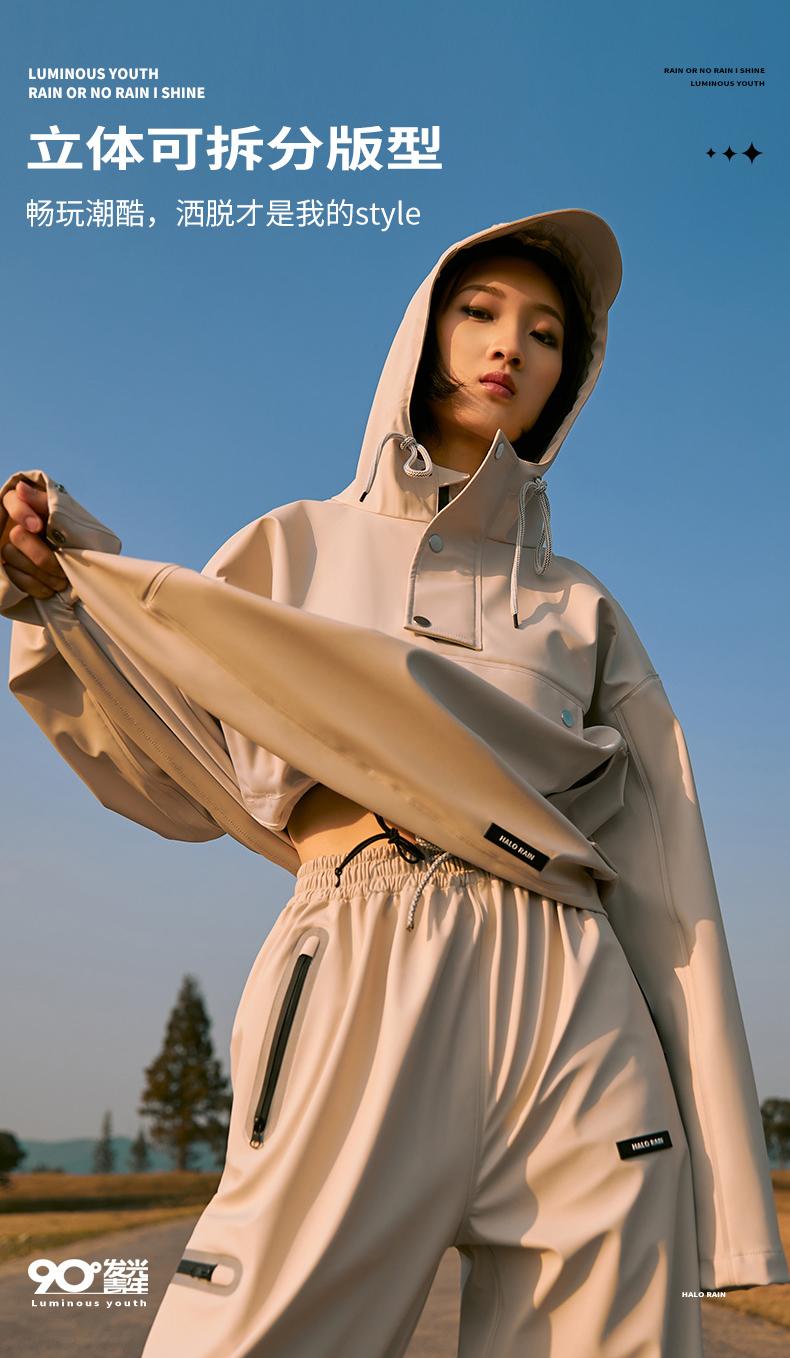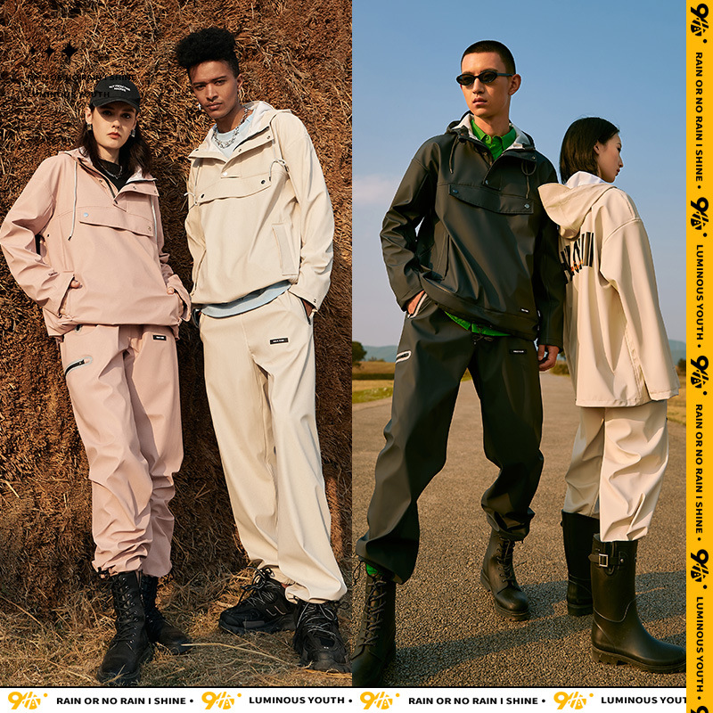 主要特点:套头防水上衣加防水裤,立体可拆分版型,穿脱简便、洒脱。