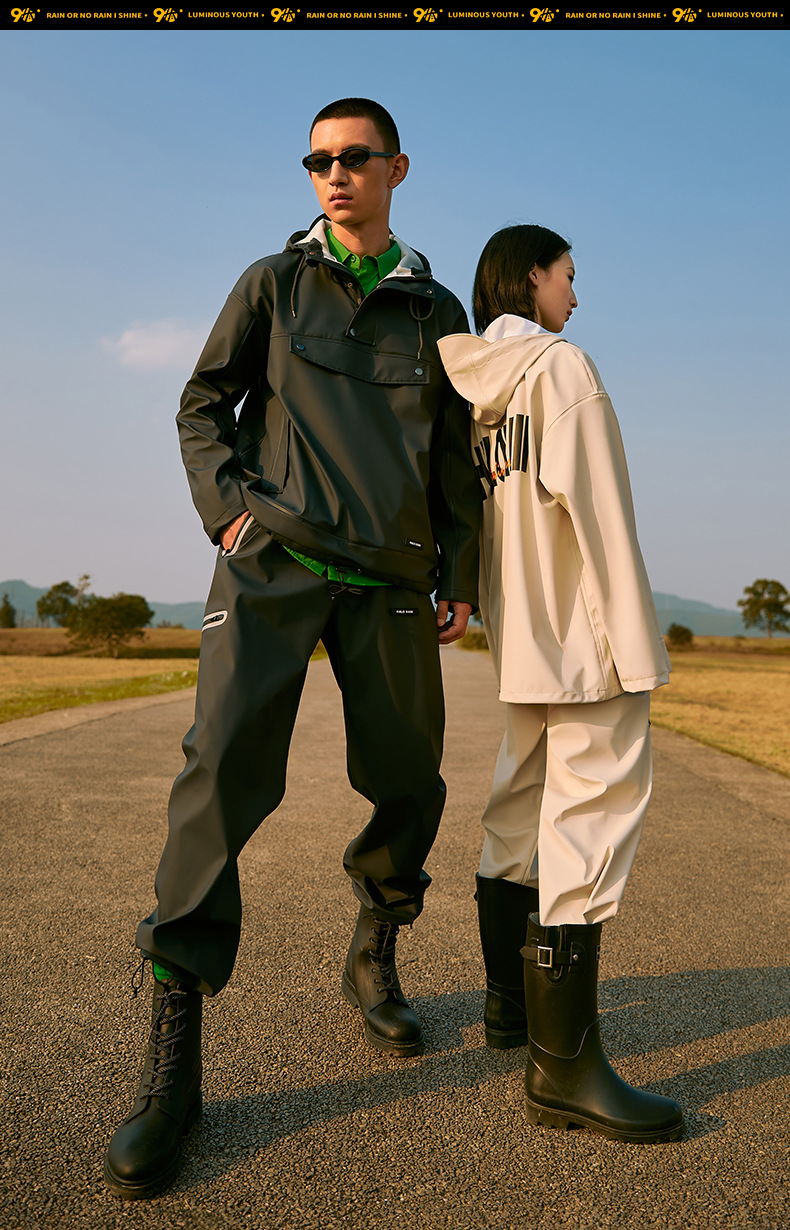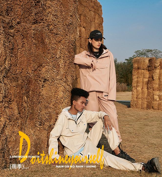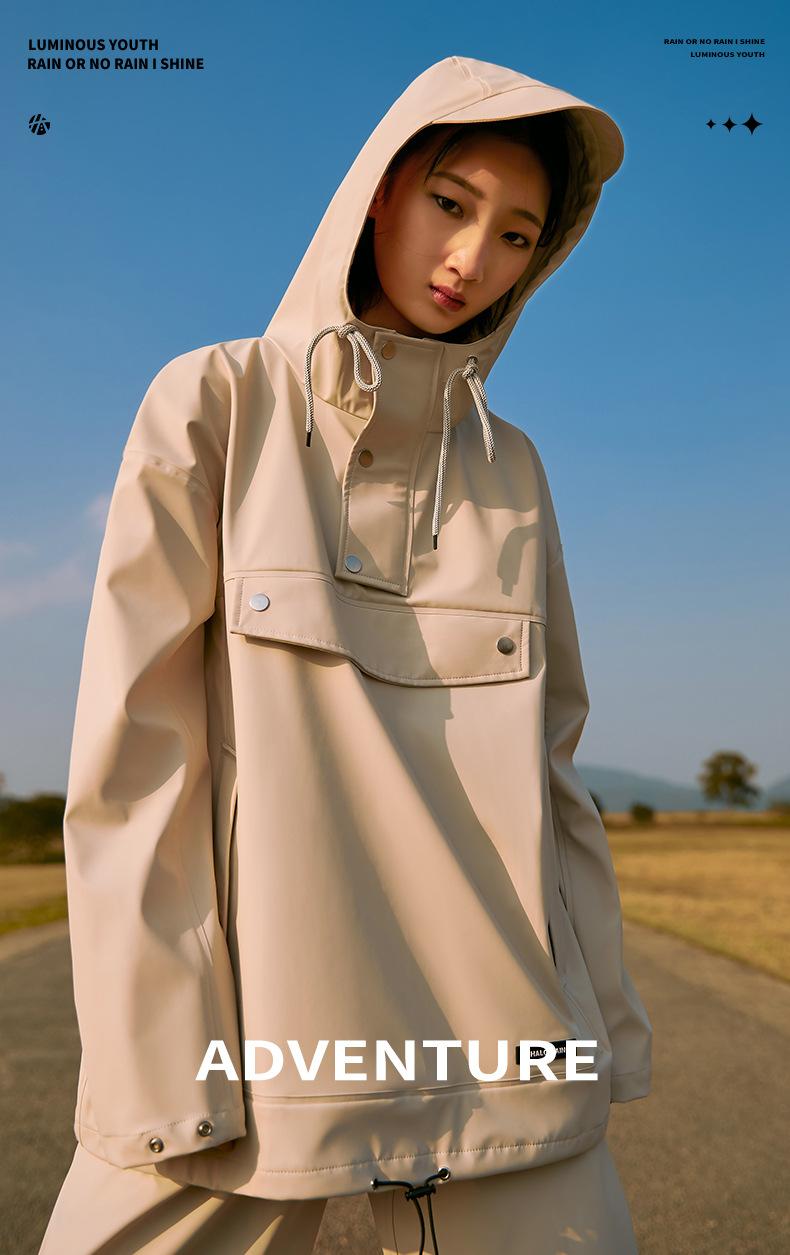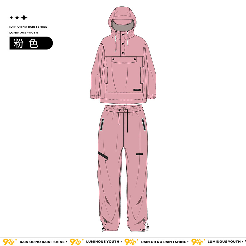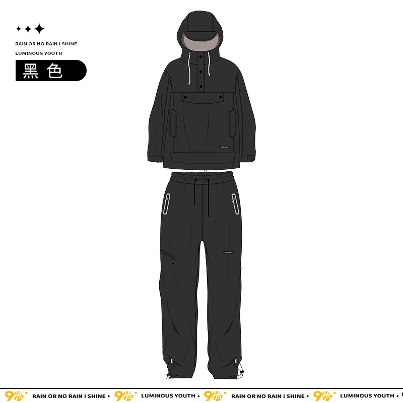 主要特点:套头防水上衣加防水裤,立体可拆分版型,穿脱简便、洒脱。