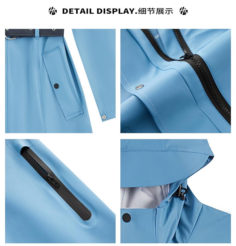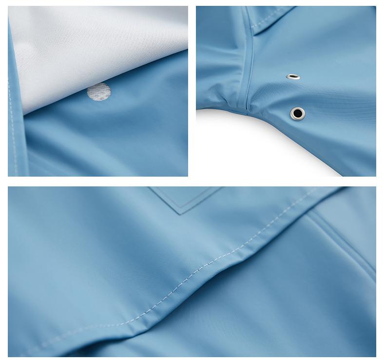 面料材质:针织PU复合,手感舒适,穿着自然挺括有弹性。高频焊接工艺,接缝处美观大方且具有防水功效。