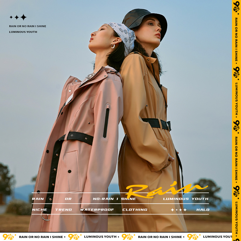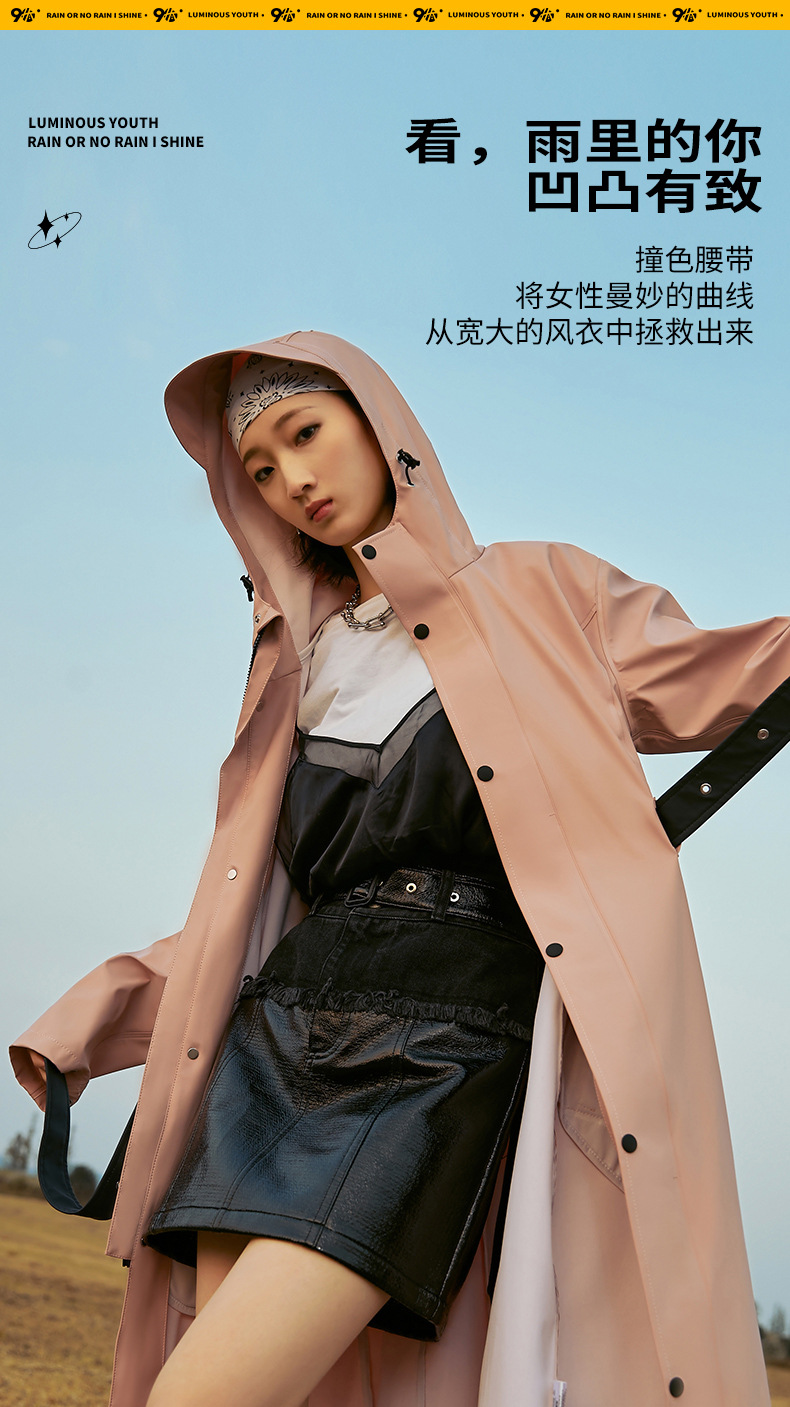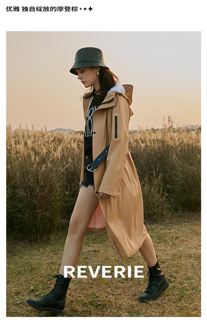 徽雨品牌,REVERIE系列,PU束腰风衣,满足女性对潮流幻想的PU风衣,束腰长款、胸部、背部线条感,更凸显女性身材,晴雨两用,可酷可飒。
