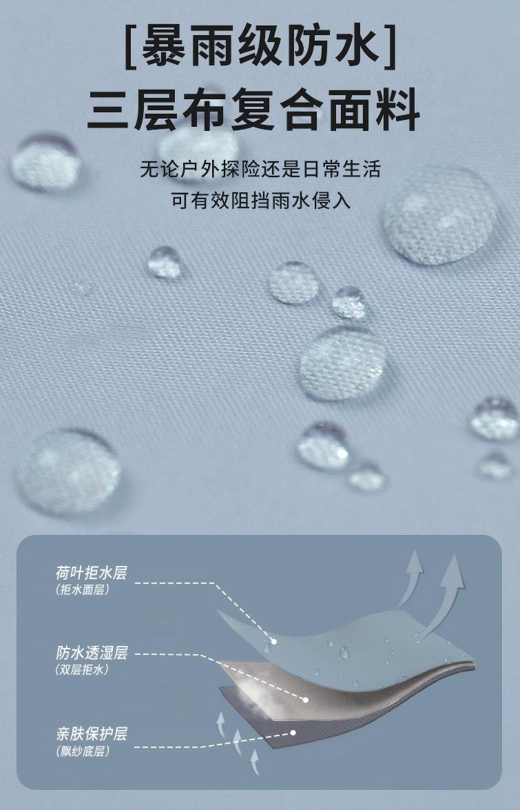 主要特点:三层布复合面料,暴雨级防水,适合日常通勤、户外露营、徒步登山等多种场景。
